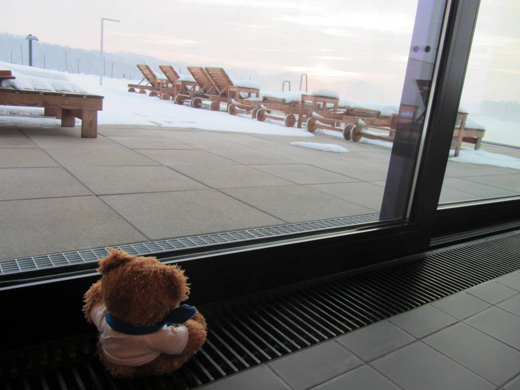 Der Außenpool sieht im Sonnenlicht so genial aus (metallisch – blau – reflektierend), dass ich gar nicht mehr wegschauen konnte. Ein wenig frisch ist das Wasser im Pool, aber nach einem Saunagang ideal.