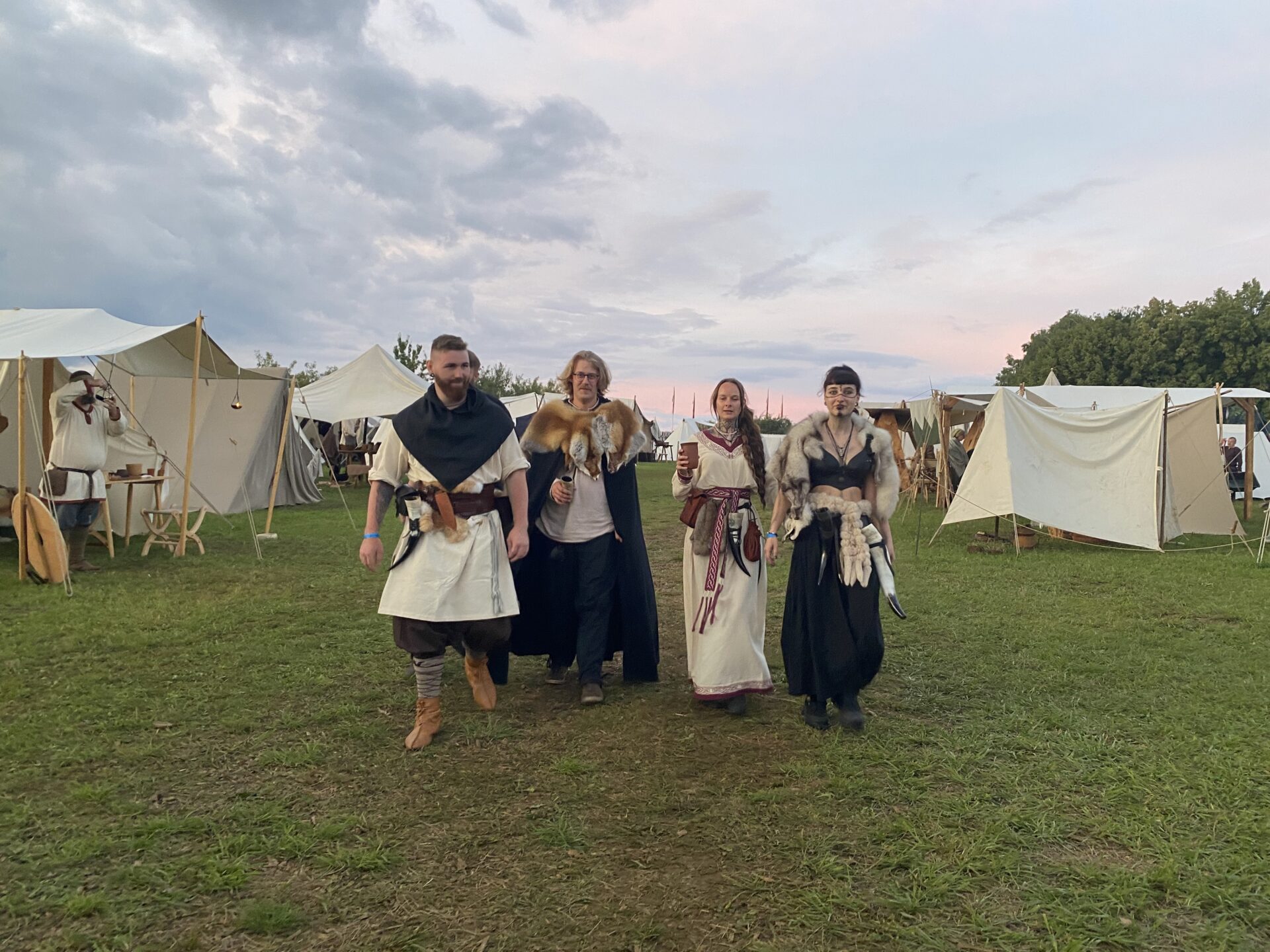 Die Gesprächsatmosphäre ist freundlich, höflich, witzig. Die Menschen wirken nicht so gestresst wie auf einer Kirmes. Der Geräuschpegel ist viel ruhiger, auch wenn die Mittelalterband Turas Math auf der Bühne Mikro und Verstärker für ihre Instrumente und den Gesang verwenden. Viele der Aussteller sind von Mai bis Oktober fast jedes Wochenende auf so einem Mittelaltermarkt, so wie andere Menschen zu Fußballspielen gehen.