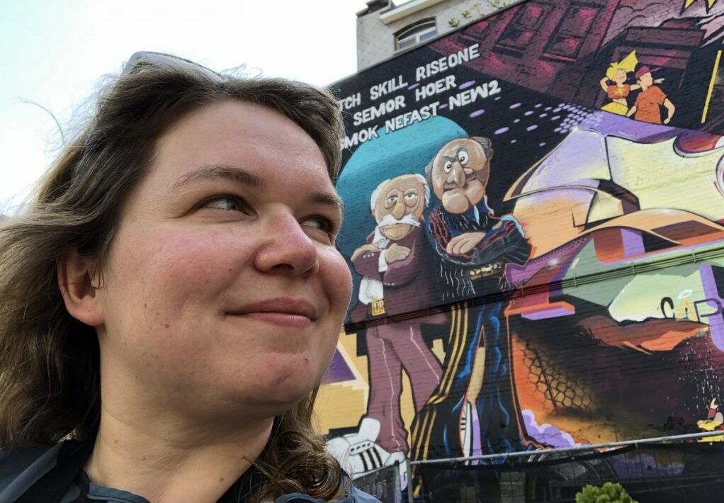 Irgendwann habe ich die Orientierung verloren. Wo uns Tim hinführt? Keine Ahnung. Und doch entdecken wir durch ihn ein Antwerpen der völlig anderen Art. An einer Schule sitzt eine Hexe auf einem Baum während Fabelgestalten am Baum sägen, und keine paar Meter weiter ist ein kleines Streetart an der Wand eines Parkhauses zu entdecken.